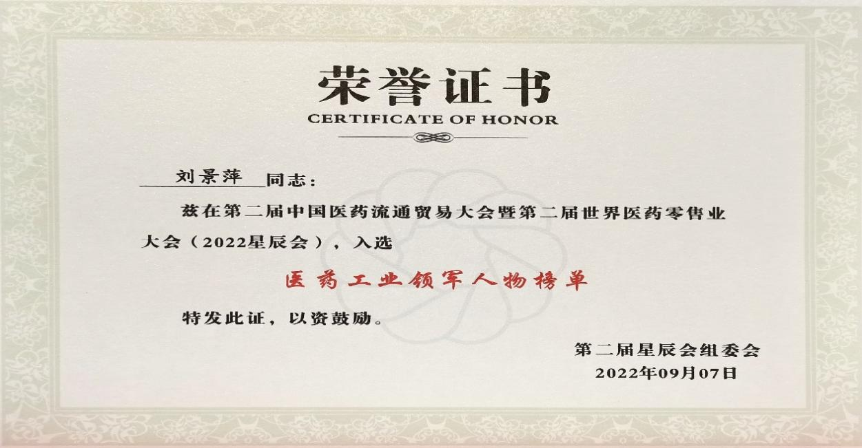 在本次开幕式上,发布了“医药工业领军人物”、“医药零售领军人物”榜单,7790必发集团药业集团刘景萍董事长凭借在儿药领域多年的努力探索和对行业的杰出贡献,荣获“医药工业领军人物”称号。